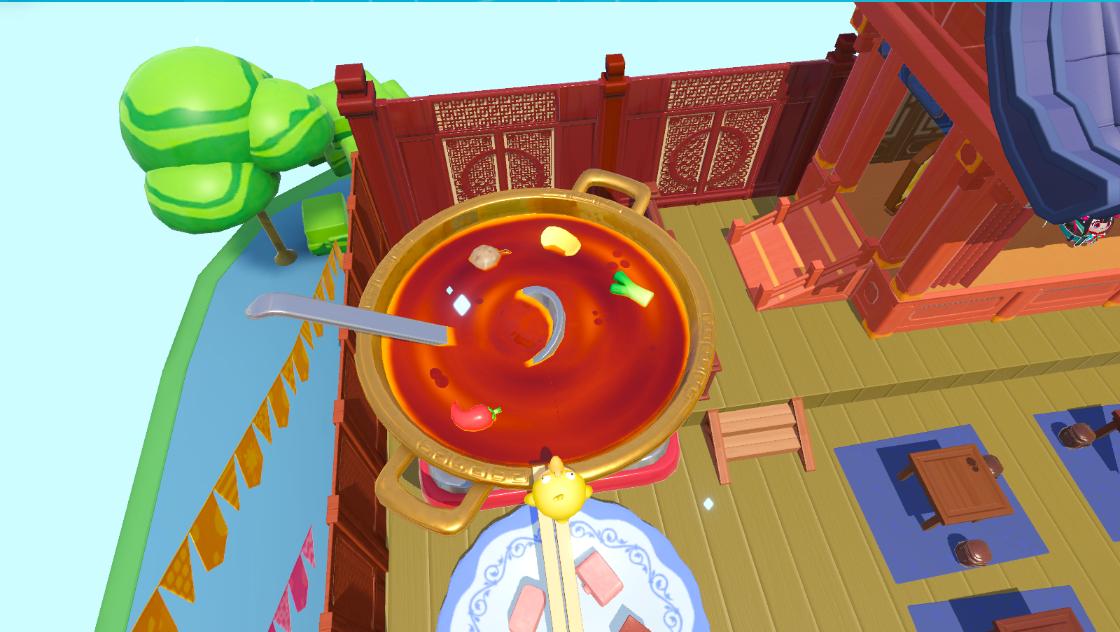 除了外观盲盒以外,蛋仔岛的主城中也增添了许多川蜀风味装饰,巨大的摩天轮旁边突然搭建起一座川剧戏台,红木青瓦的传统配色古韵十足,戏台旁居然还有一口巨大的黄铜火锅!红油汤底火辣鲜香,小蛋仔们顺着筷子跳进去,说不定会发生些奇特的现象。