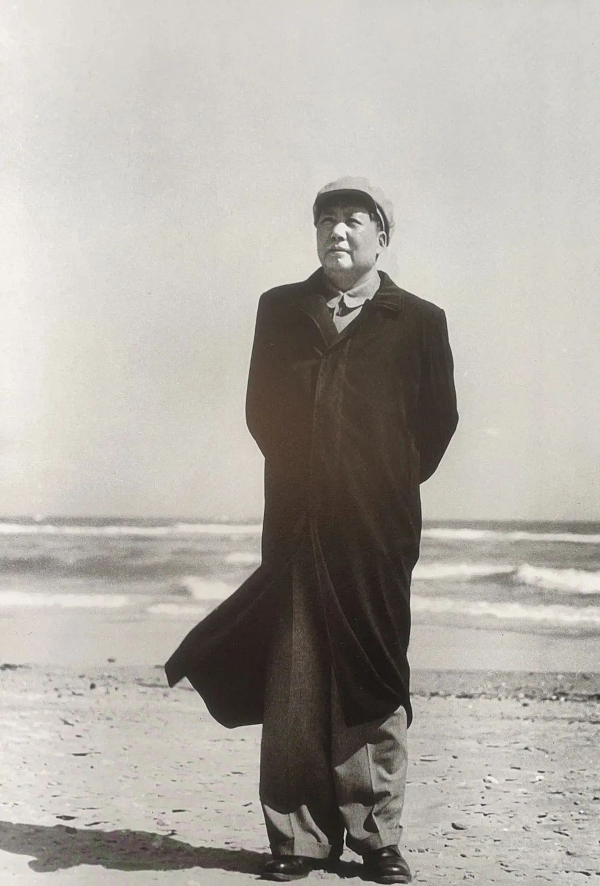 首先想到的就是毛主席在北戴河那张十分著名的负手站立图,照片中的毛主席身穿中山装,是中华人民共和国的象征,神情威严而又肃穆,十分有领袖风范。