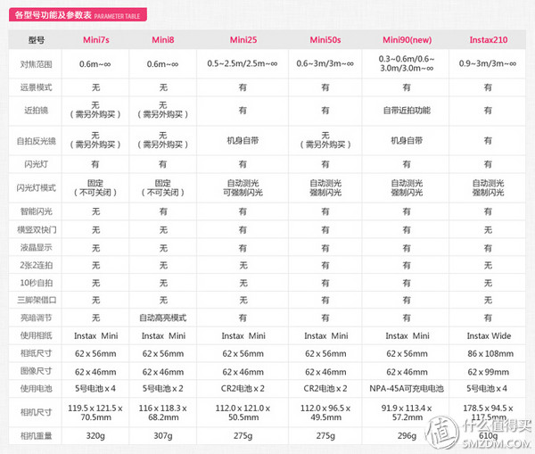 最后为大家奉上一张富士官方的参数对照表,可以更加简单明了的查看每款拍立得之间的差别。