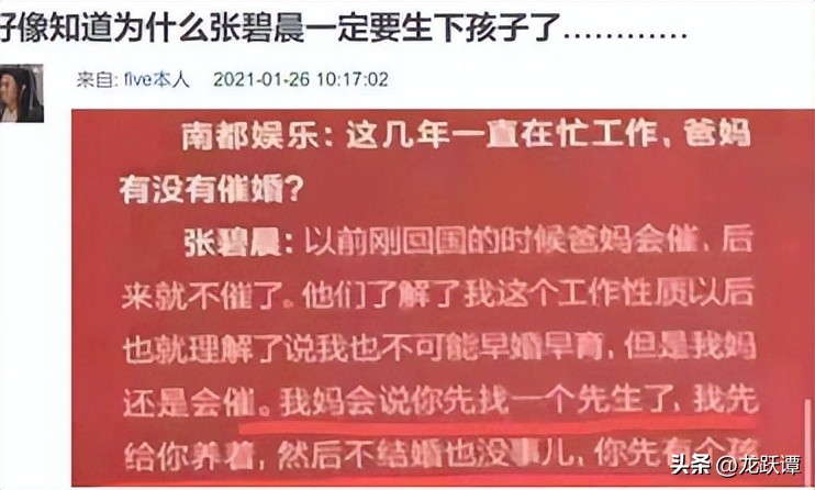 张碧晨的母亲知道歌手行业的艰辛,也明白公众人物公开婚讯的影响,于是调转方向,希望张碧晨先找到合适的对象,生个孩子,然后再好好拼事业。