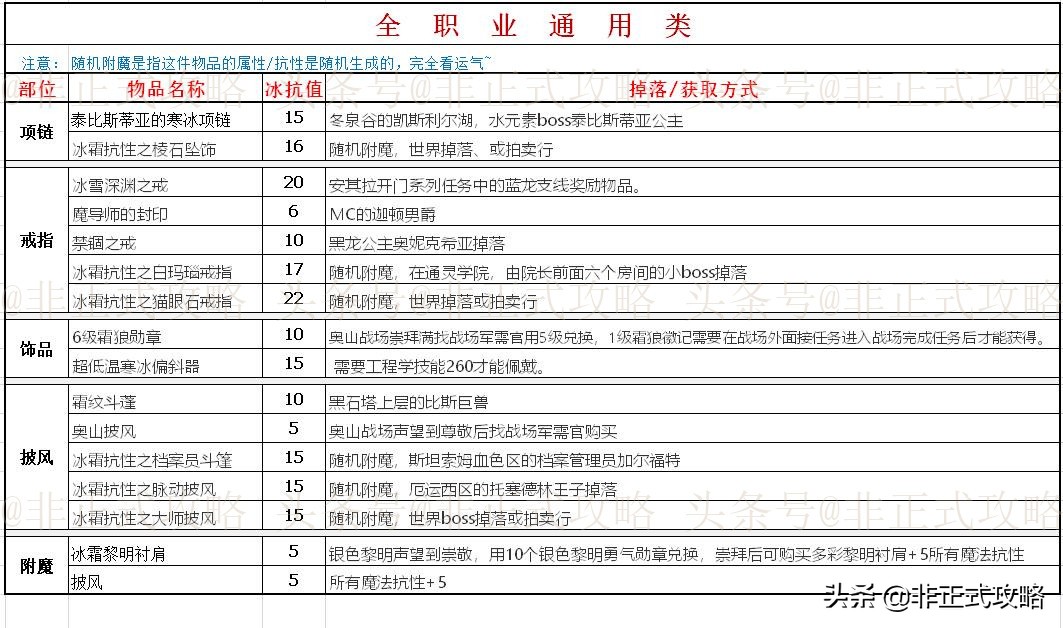 首先,有些部位的冰抗装备是全职业通用的,所以我放在一起了,如下图所示,点击图片可放大、保存。其中有装备名称以“冰霜抗性之XXX”开头的大多是随机生成属性或抗性,完成看个人运气。“拍卖行”是指装备绑定,可以从拍卖行搜索、购买。