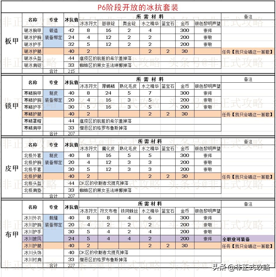 最后,我把P6阶段开放后的冰抗套装信息糅合成了一张表格,大家可以看一看。在套装列表中也标注了哪几个是可以学习的图样。