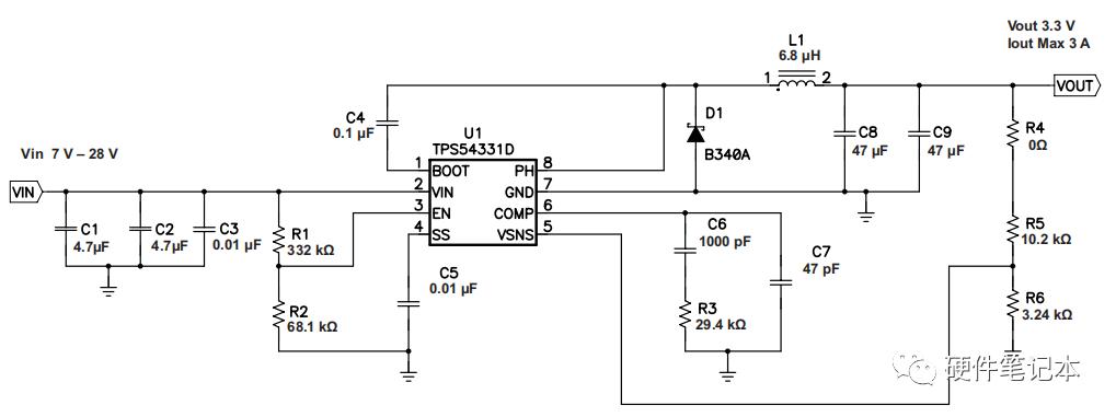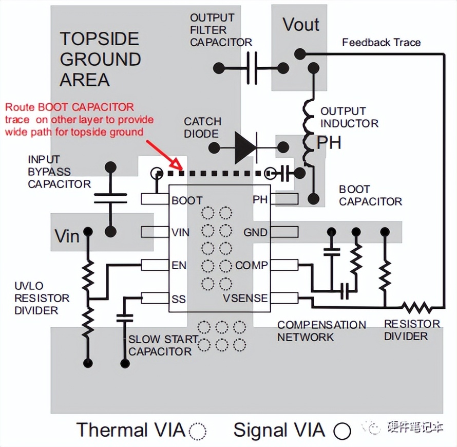 既然是BUCK芯片引起的,首先想到的是PCB布板,再对照规格书查看。以下是PCB参考布局。
