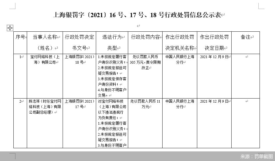 12月13日,央行上海分行新增行政处罚信息,宝付支付因未按规定履行客户身份识别义务、未按规定报送可疑交易报告、未按规定保存客户身份资料、与身份不明客户交易四项违法行为,被央行处以罚款人民币305万元,责令限期改正,作出处罚的时间为2021年12月9日。