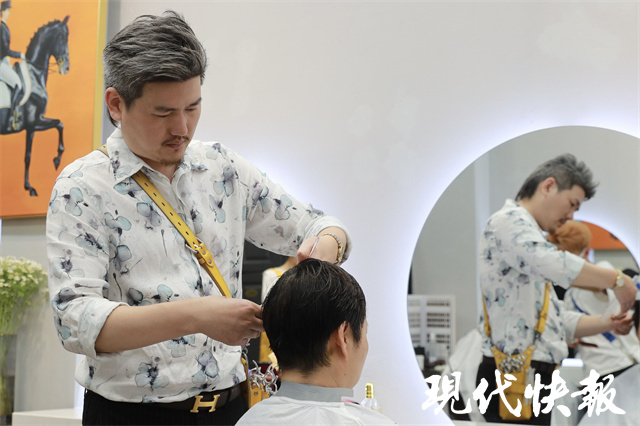 △彭磊正在给顾客理发