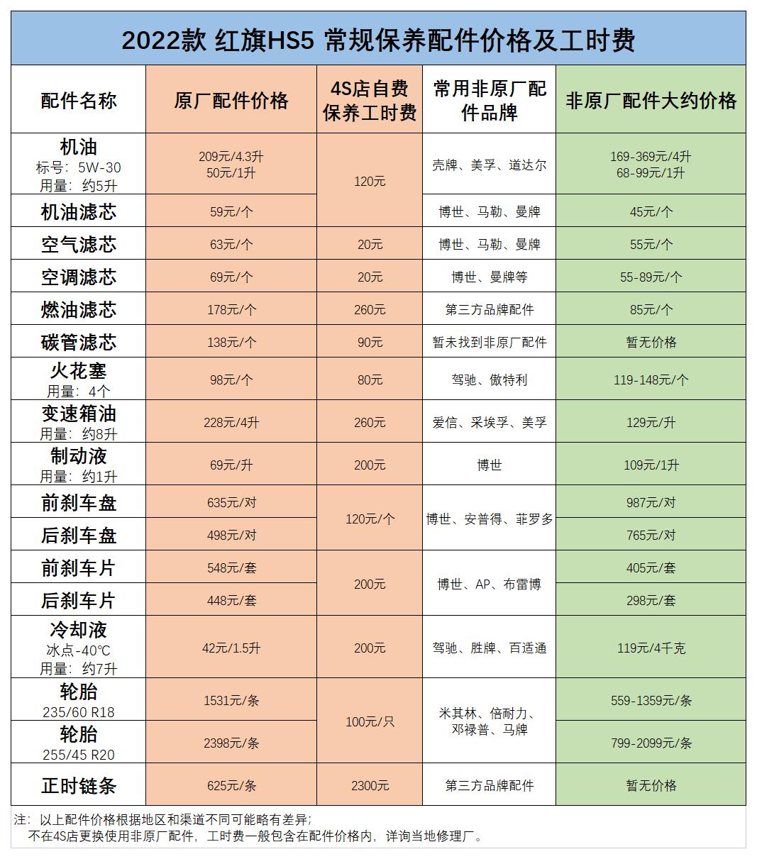2022款红旗HS5常规保养各项目价格汇总,心中有数少花冤枉钱