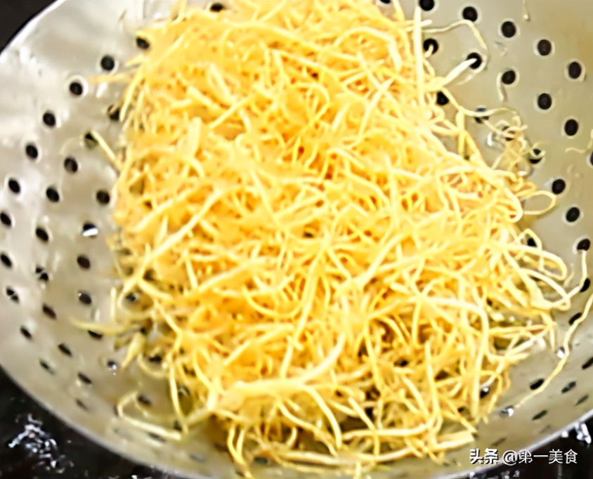 锅内烧油,油烧至5成热时倒入土豆丝炸90秒左右,一直保持中火,土豆丝炸至金黄色,非常的焦脆以后捞出控油。