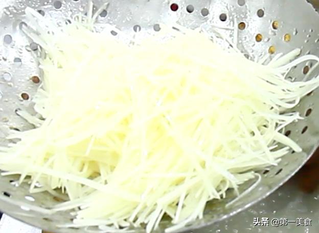 准备一个土豆洗净后削去外皮,从中间一分为二,先切成薄片,码整齐以后再切成细丝,尽量的切细一点,切好后的土豆丝 要迅速的泡在清水中,洗去上面的淀粉以后捞出控干水分。