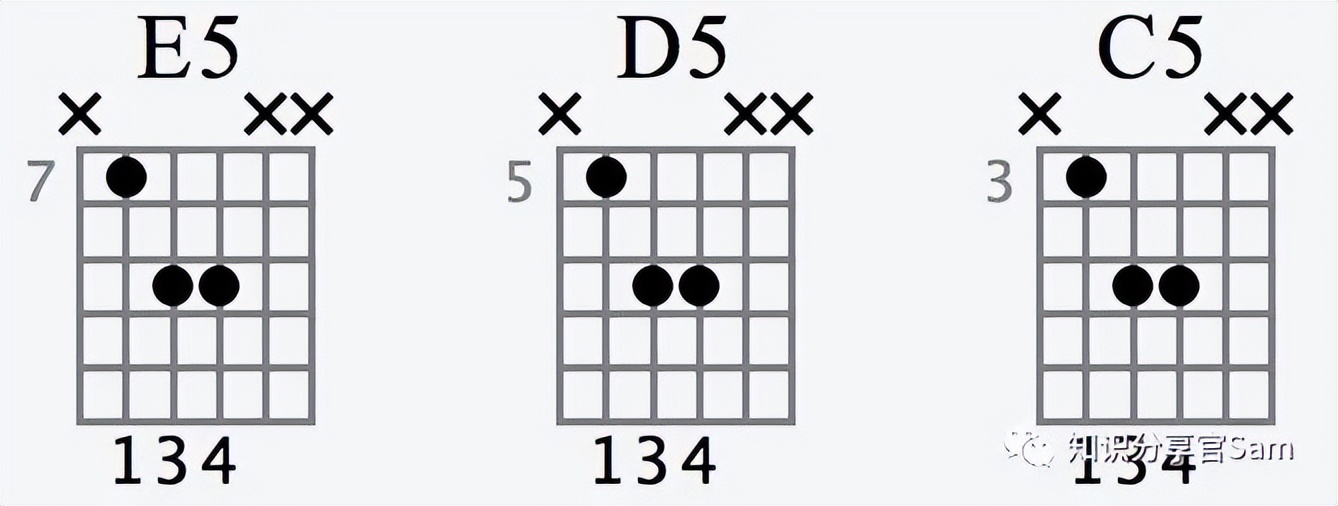 强力五和弦非常好推导,根据吉他指板逻辑,除2弦外,其他弦与弦之间为大四度关系,五和弦之间为五度关系,因此只需要确定根音所处的品位,另一个音就在下一根弦隔一个品位(2弦的话隔两个品位);同时根据全半音关系,也可以快速推导出后面的指法。例如上图C5和弦,根音在5弦3品,那D5和弦就是往下移两个品位,根音在5弦5品。