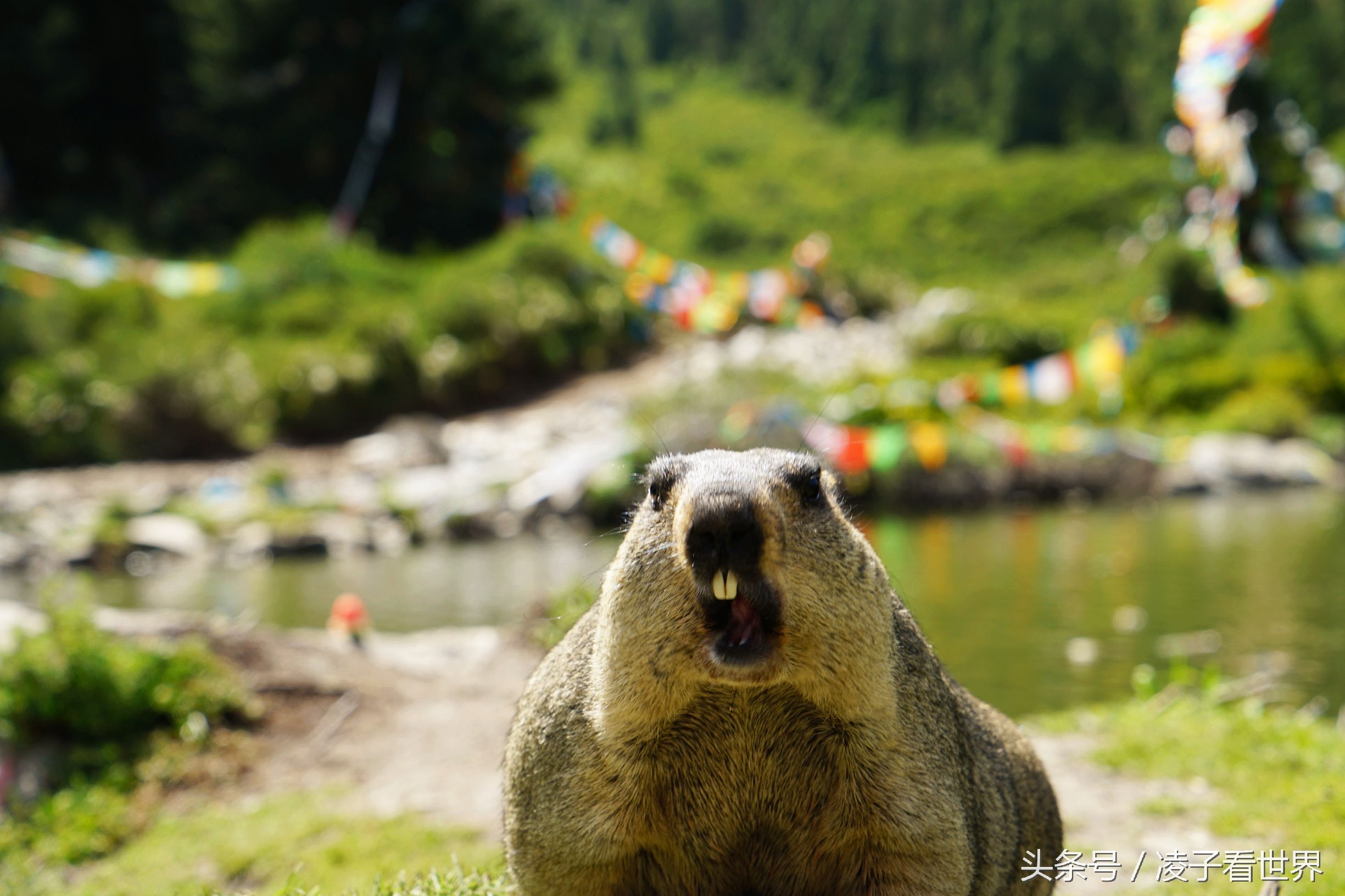 而现实版的土拨鼠是生活在碧绿的高山草原,居然也是个贪吃鬼。从夏河县开车经过一个小时我们来到了达尔宗湖边,下车步行十分钟就看到湖边几只又肥又大的土拨鼠慵懒的在湖边溜达。由于这里无人伤害它们,反而会有很多人时不时来这里喂食,所以它们一点都不怕人。只要你拿出食物它就会蹒跚而来,听说它很喜欢吃西瓜,就准备了西瓜给它吃。看它端着西瓜那憨样,逗得大家哈哈大笑。一直不停的逗它,西瓜吃完了。它居然还要吃烧饼,可真是个吃货,不怕吃多就怕吃少。这些小家伙们只有在高山草甸才会看到,它们也适合生活在这里。