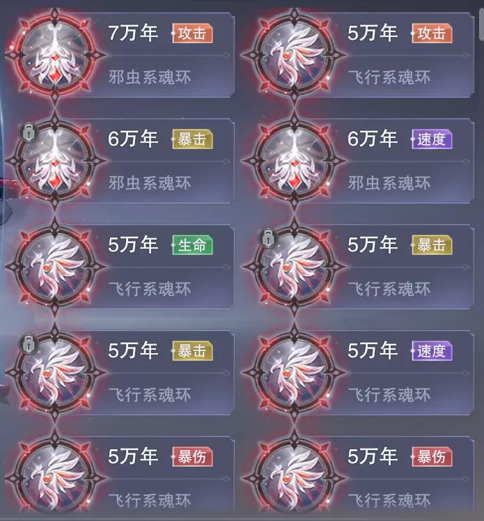 在上表中我们可以看到基础5万年魂环的最高属性,例如攻击属性的最高值是11.1%,而升级到10万年魂环之后这个属性会提升到24%,又例如暴伤的5万年魂环最高属性是19.3%,而这个属性在升级到10万年魂环之后会提升到48%,因此选择一个高属性的5万年魂环便是我们的最基础原则,如果没有最高属性,退而求其次选择次高属性也是可行的,例如攻击百分比的次高属性就是9.4%,这个也是可以选择的。