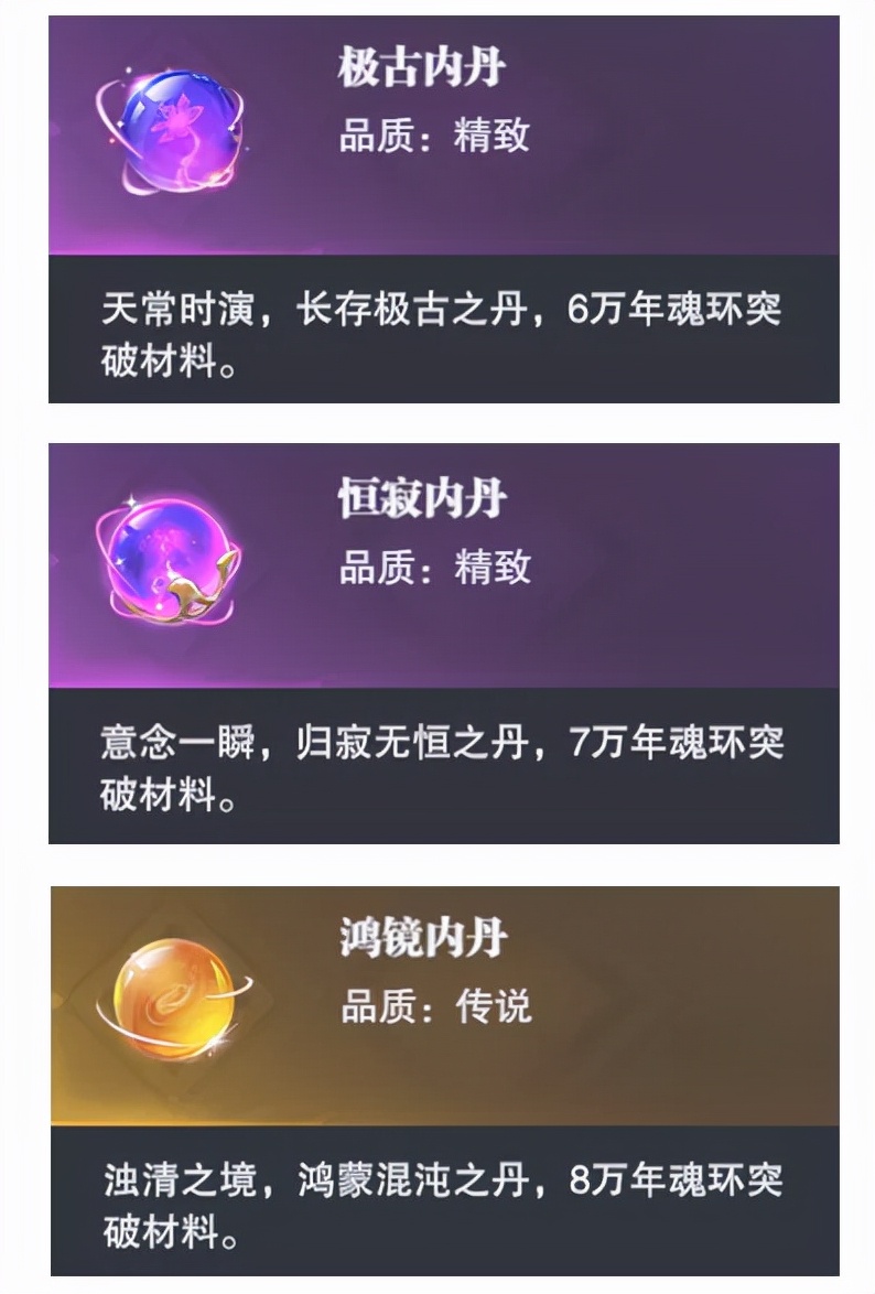 今天的最后一部分内容便是魂环年限的培养,大家都知道目前的5万年魂环是可以进行升级的,最高可以升到10万年魂环,但是在升级过程中我们会遇到不少的困难和概率问题,例如在7万年魂环升级到8万年魂环的过程中的“鸿镜内丹”就暂时还没看到出处,而5-6万年和6-7万年的“极古内丹”和“恒寂内丹”则是在部分打魂环的副本里有不低的几率爆出,所以不少朋友便会生出这样一个疑问:没有突破到8万年的内丹,是否我们在升级8万年、9万年甚至10万年魂环时便只有碰运气了呢?这个问题的答案当然是no,接着维一就给大家来讲讲不同年限升级时的保底机制:
