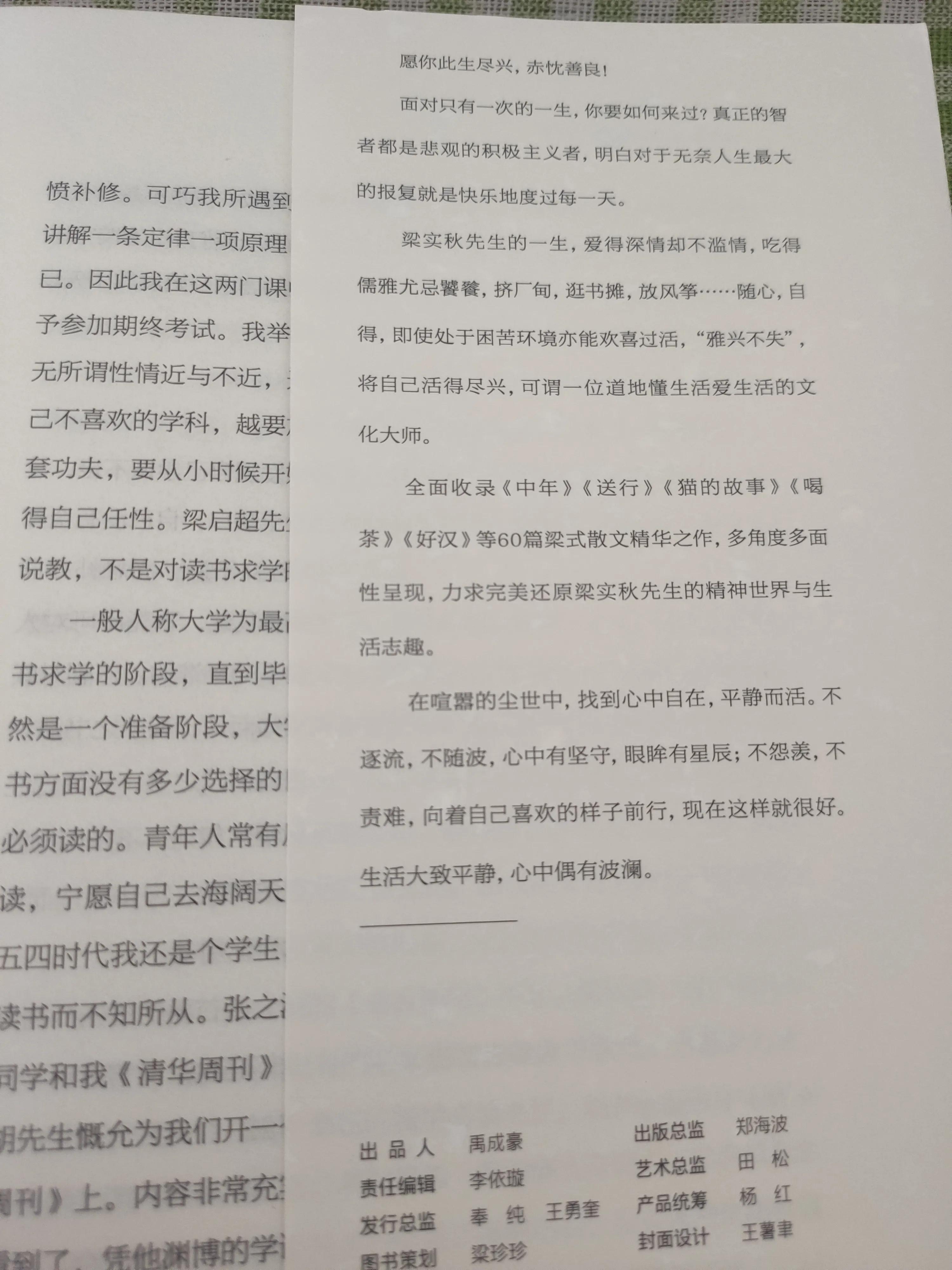 如书中所说梁秋实的散文,体现出一种清雅脱俗情怀,闲毅超然气息。读完此书,感触甚深。打开书本,先是简单的水墨画配备文字。最喜欢里面的文字: