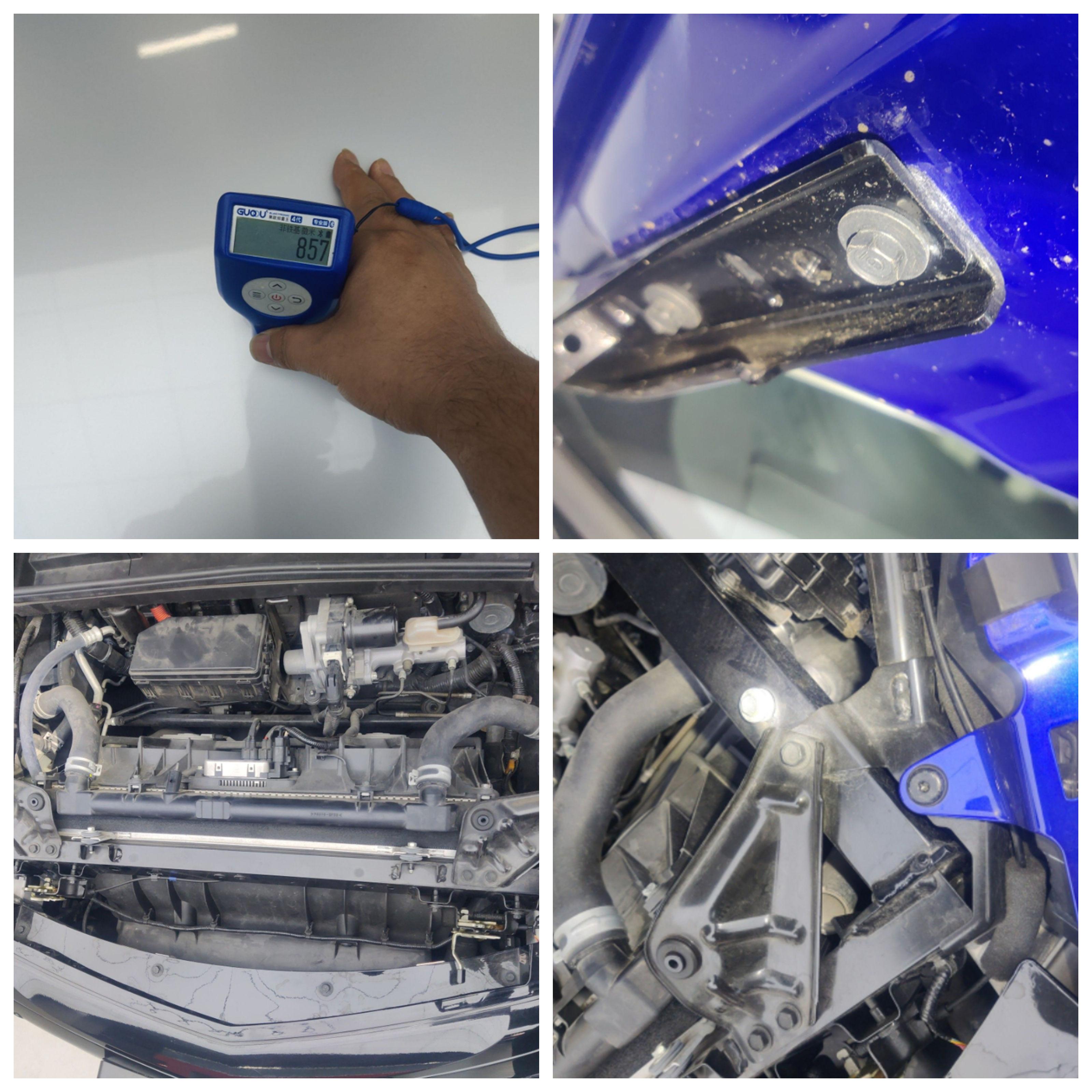由于这辆车是手工组装,配件都有拧动的痕迹,属于正常现象,经过我的检测前机盖漆面数值比较高,800多可能有过喷漆的情况,水箱框架以及翼子板骨架这些都没问题,接下来我们看一下左右两侧。