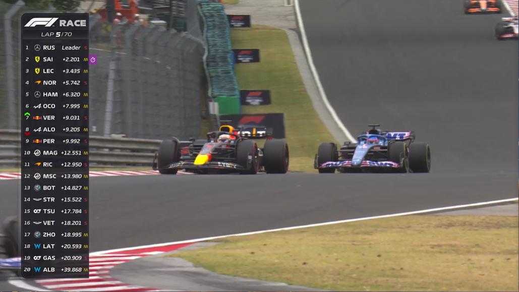 阿隆索在3号弯冲出赛道,维斯塔潘抓住机会完成超越。