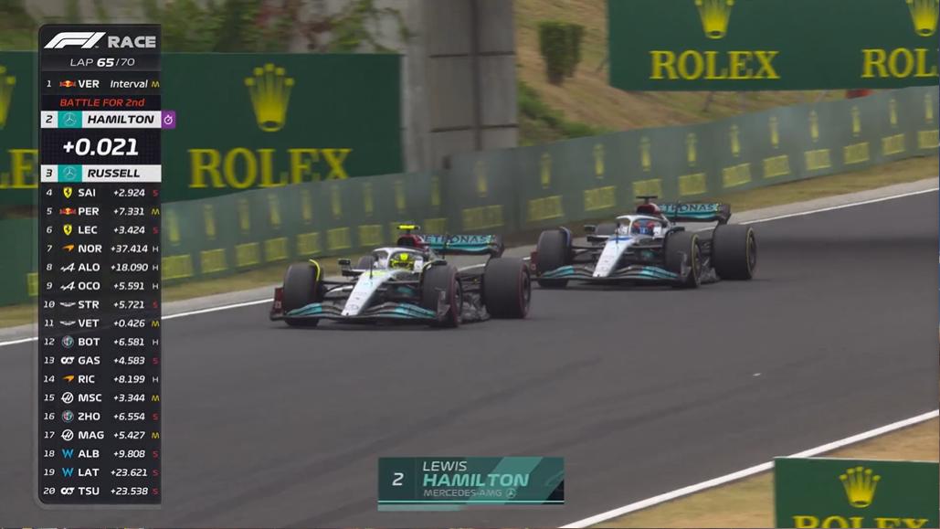 第65圈,轮胎上具有优势的汉密尔顿完成了对拉塞尔的超越,上升至第二位。