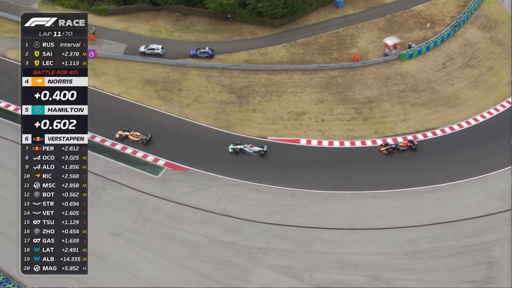 第11圈时,诺里斯、汉密尔顿和维斯塔潘在争夺第四的位置,但后两位车手都有DRS。