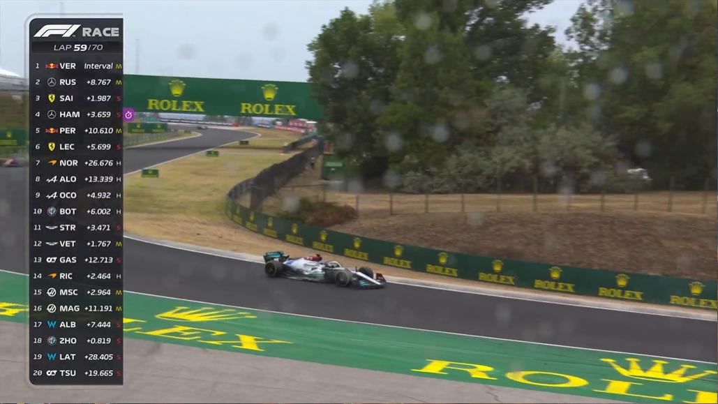 第59圈,维斯塔潘位于领跑位置,拉塞尔第二落后8秒。汉密尔顿持续在缩小与第三名塞恩斯之间的差距,汉密尔顿落后塞恩斯3.6秒。