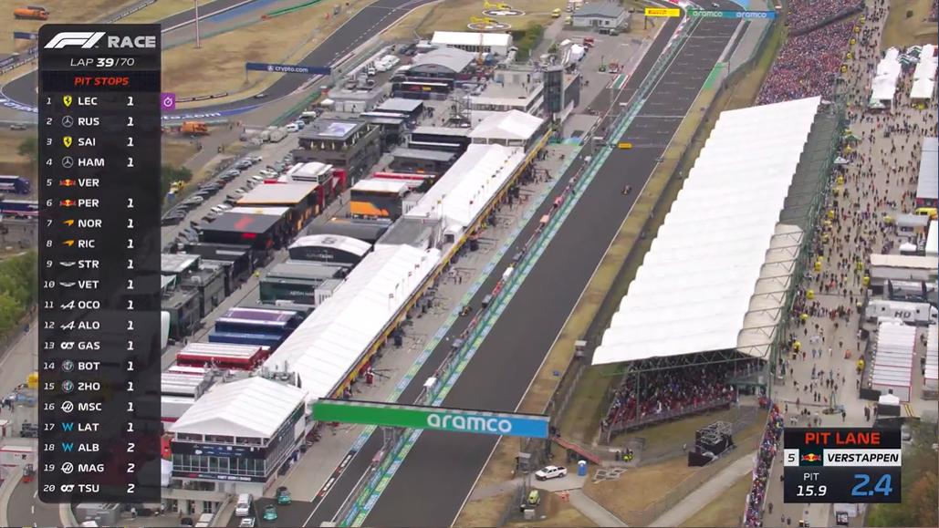 第39圈,距离头车勒克莱尔7秒左右的维斯塔潘进站,换上中性胎后位列第六。