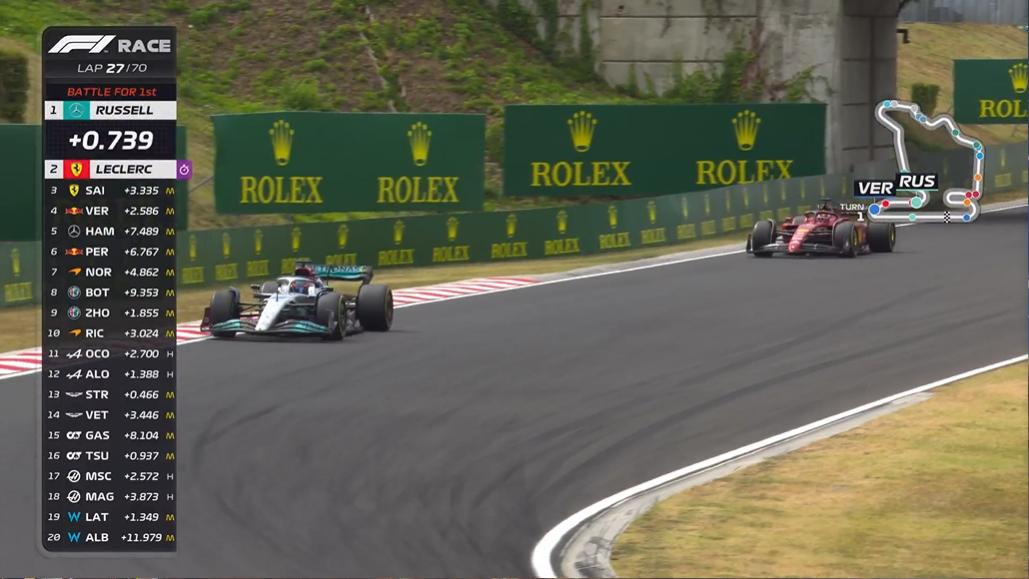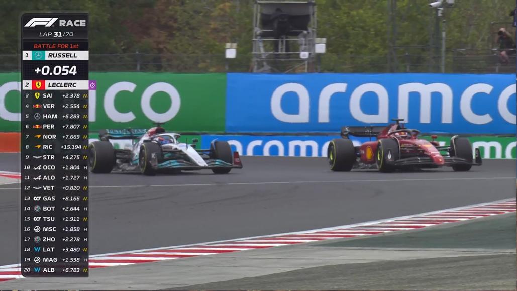 经过几圈的缠斗,第31圈,勒克莱尔在1号弯超越拉塞尔,并迅速将差距拉开至1秒以外。