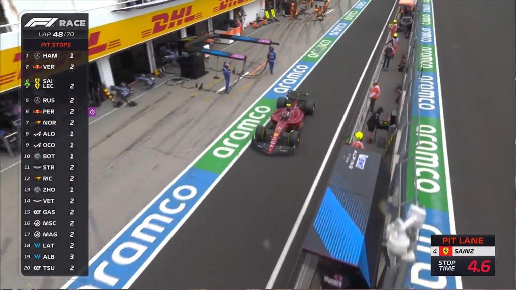第48圈,塞恩斯进站更换软胎,用时4.6秒,出站后排在第五位。