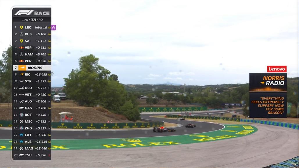 第12圈,汉密尔顿打开DRS在1号弯超越诺里斯,紧接着同样拥有DRS的维斯塔潘在第二段DRS区超越了诺里斯,诺里斯连丢两个位置。