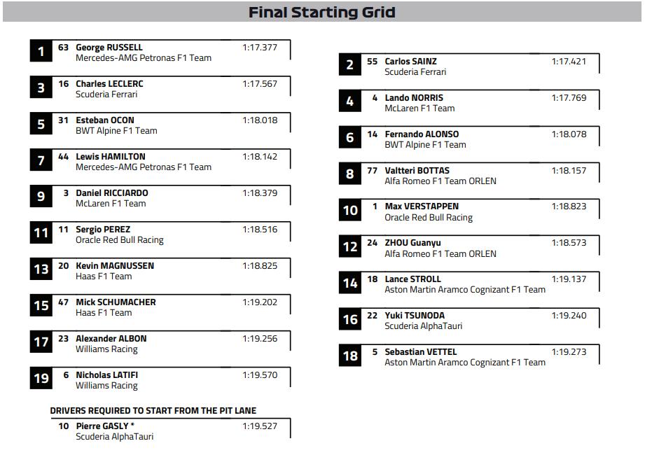 在前一天的排位赛中,拉塞尔以0.040秒的微弱优势胜过第二的塞恩斯,夺得F1生涯首杆。勒克莱尔第三,诺里斯发挥出色排名第四。两位Alpine车手从第三排起跑。