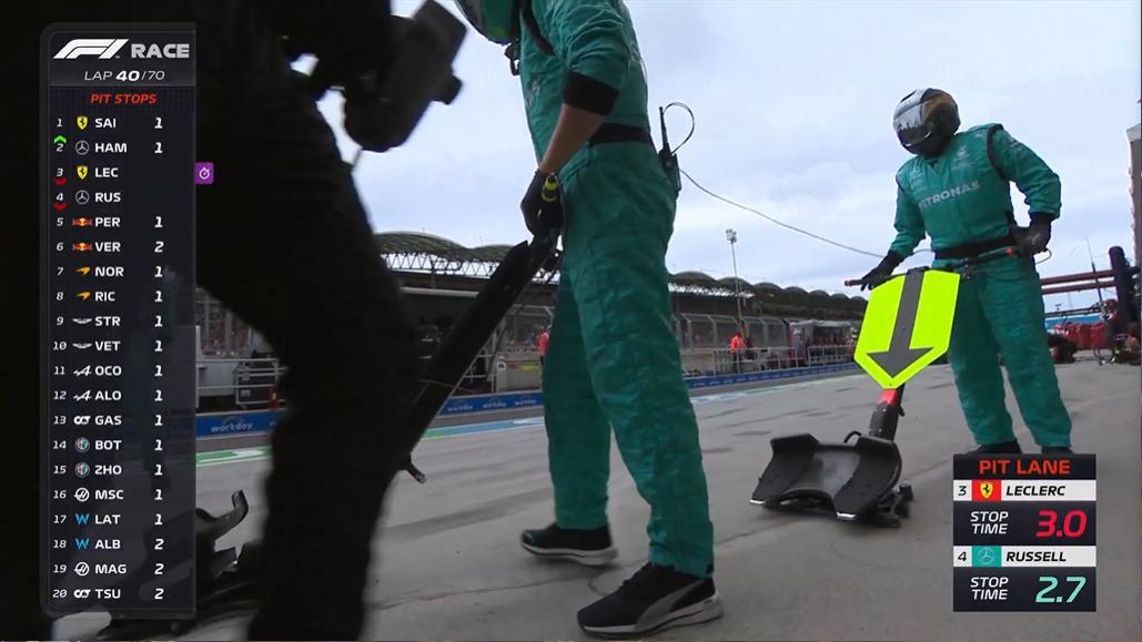 塞恩斯在下一圈进站,但他们的换胎也慢了,用时4.6秒。塞恩斯没能利用进站超越拉塞尔。