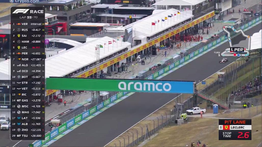 第54圈,勒克莱尔在硬胎之下毫无速度优势,拉塞尔打开DRS,在发车直道上完成了超越。