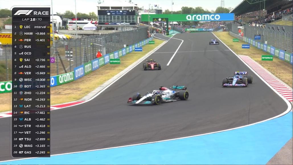 拉塞尔在1号弯险些被塞恩斯超越,汉密尔顿起步不错,超越了两台Alpine赛车来到第五。