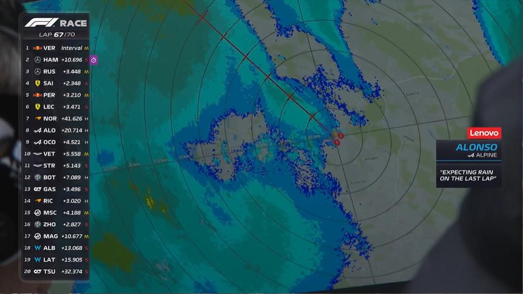 阿隆索的工程师预测,在比赛的最后一圈可能会下雨。