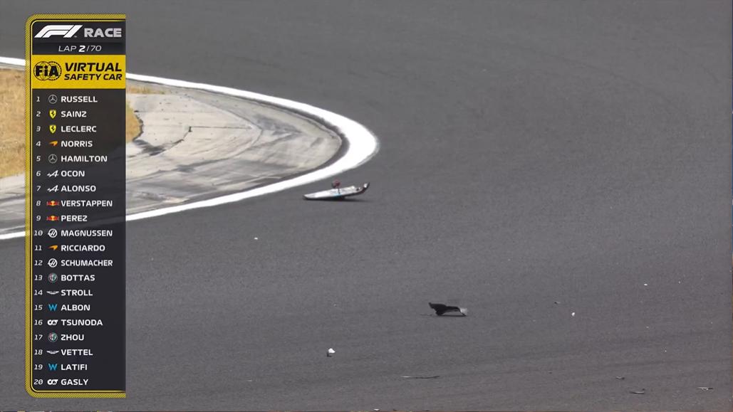 维特尔在发车阶段与阿尔本发生碰撞,赛会出动虚拟安全车清理赛道上的碎片。