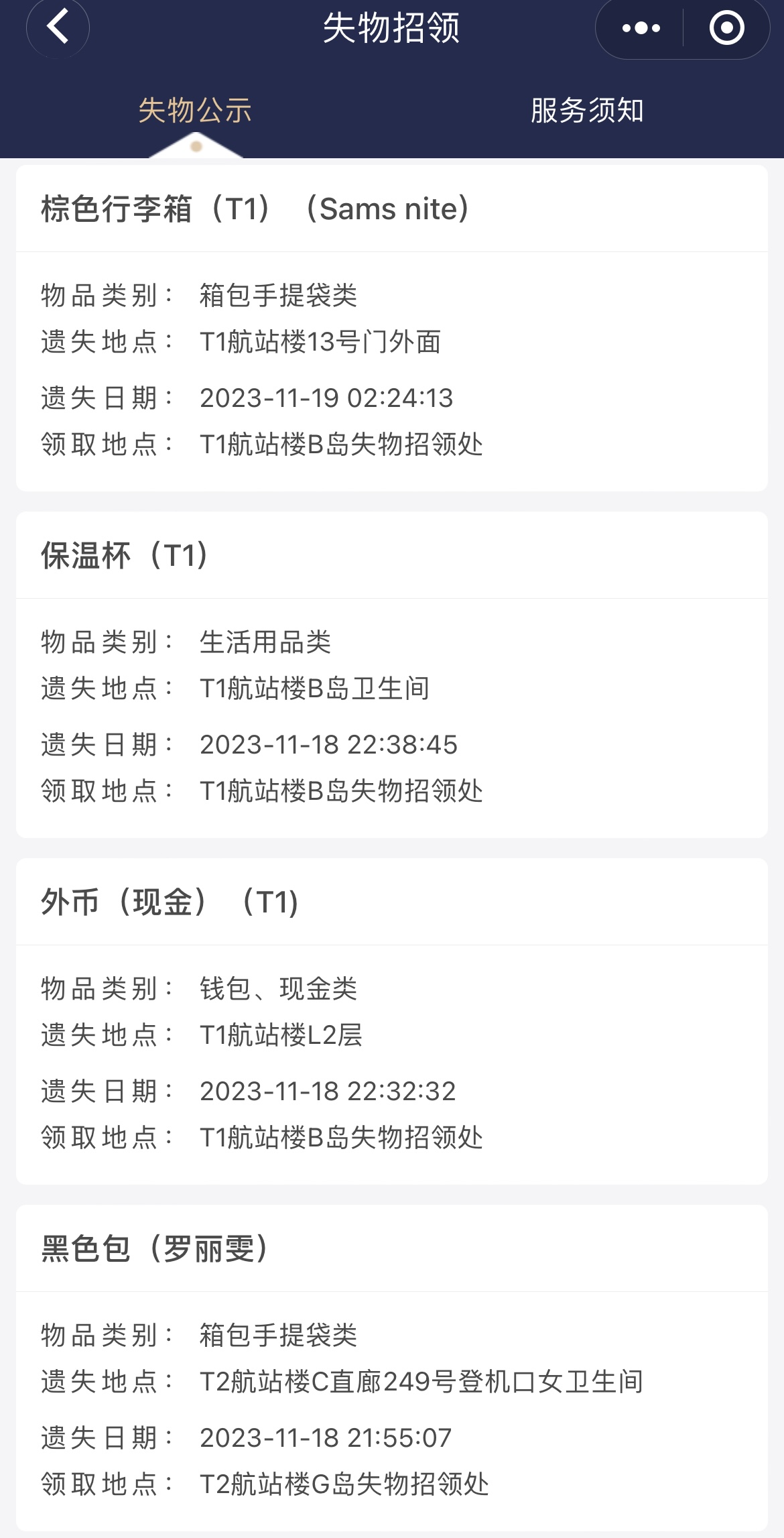 ▲双流机场公示的旅客近日遗失物品