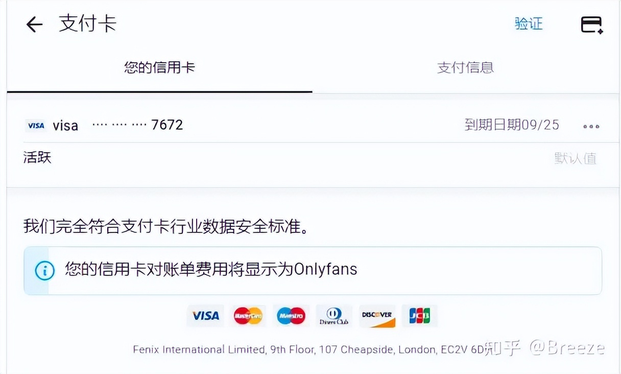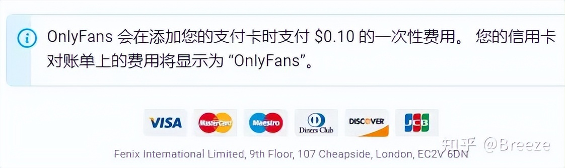 要想通过订阅来支持你喜欢的博主,你必须绑定一张信用卡,可以使用万事达,VISA,JCB,DISCOVER,Diners等信用卡组织发行的信用卡,不支持国内发行的银联卡。根据提示,OnlyFans 会在添加您的支付卡时收取 $0.10 的一次性费用。 您的信用卡账单上的费用将显示为 “OnlyFans”。如图: