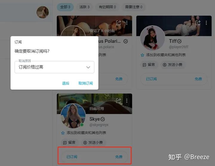 点击网站左边的“订阅”菜单,可以看到你已经订阅的博主列表,点击想要取消的博主下面的“已订阅”即可跳出取消订阅的菜单,如图: