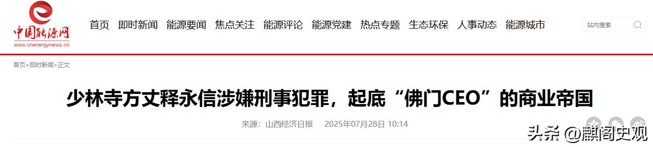 中国能源网2025-07-28《少林寺方丈释永信涉嫌刑事犯罪,起底“佛门CEO”的商业帝国》