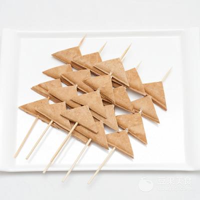 2、穿串:用竹签将豆干串起,每根竹签上串4个豆干块。