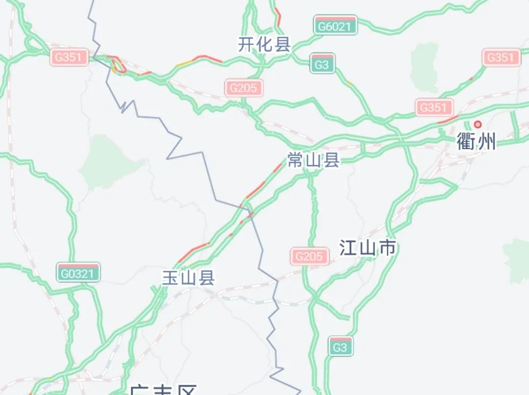 根据观察发现浙江与江西交界处是最容易出现大规模拥堵的地方,这里是浙江常山县与江西玉山县交界的地方。由于江西段为双向四车道,浙江段为双向八车道,车辆极易在这里发生长时间、长距离的拥堵。