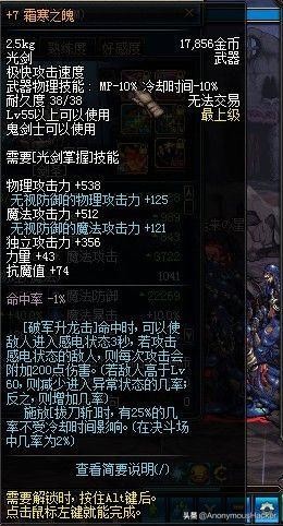 10、史苏克的一滴眼泪。被攻击时,有1%的几率使敌人进入冰冻状态2秒。(若敌人高于Lv45,则减少进入异常状态的几率和效果;反之,则增加几率和效果)