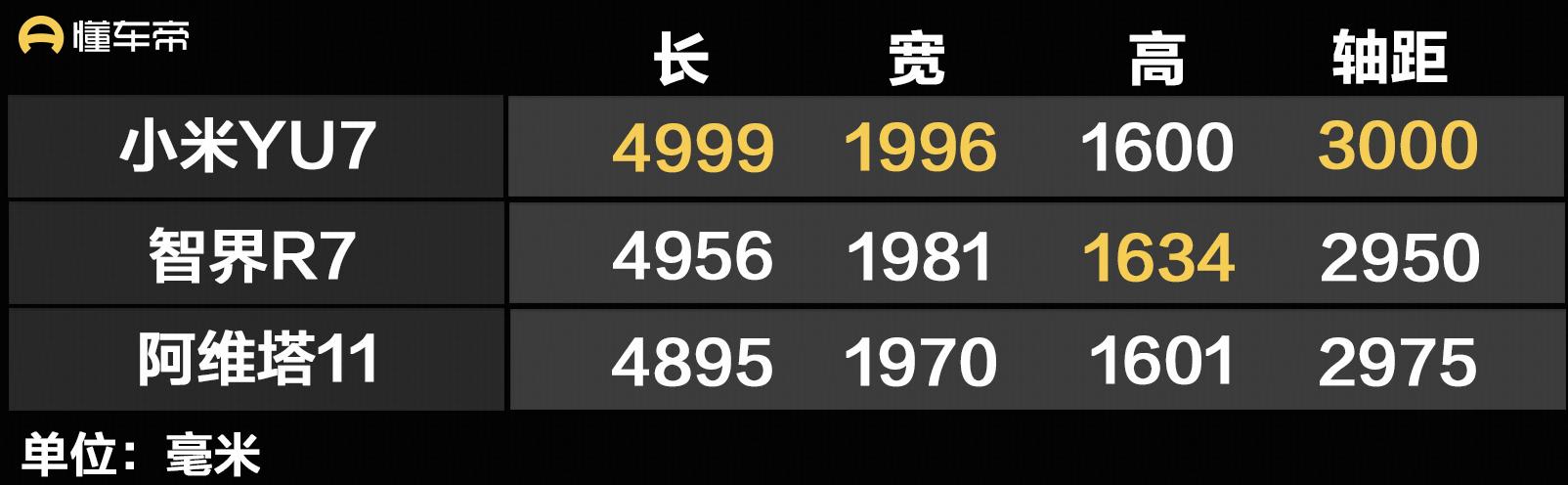 车身尺寸部分,小米YU7长宽高分别为4999/1996/1600毫米,轴距为3000毫米,定位于中大型SUV,车内采用5座布局。相比同级智界R7和阿维塔11,小米YU7在车身长度、宽度以及轴距方面有一定优势。