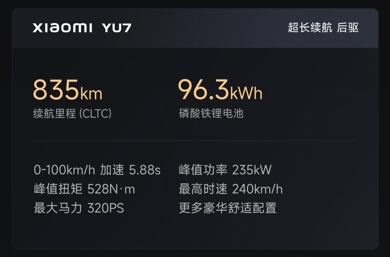 - YU7:单电机后驱,0-100公里/小时加速时间5.88秒,峰值功率235千瓦,峰值扭矩528牛·米,最高车速240公里/小时。