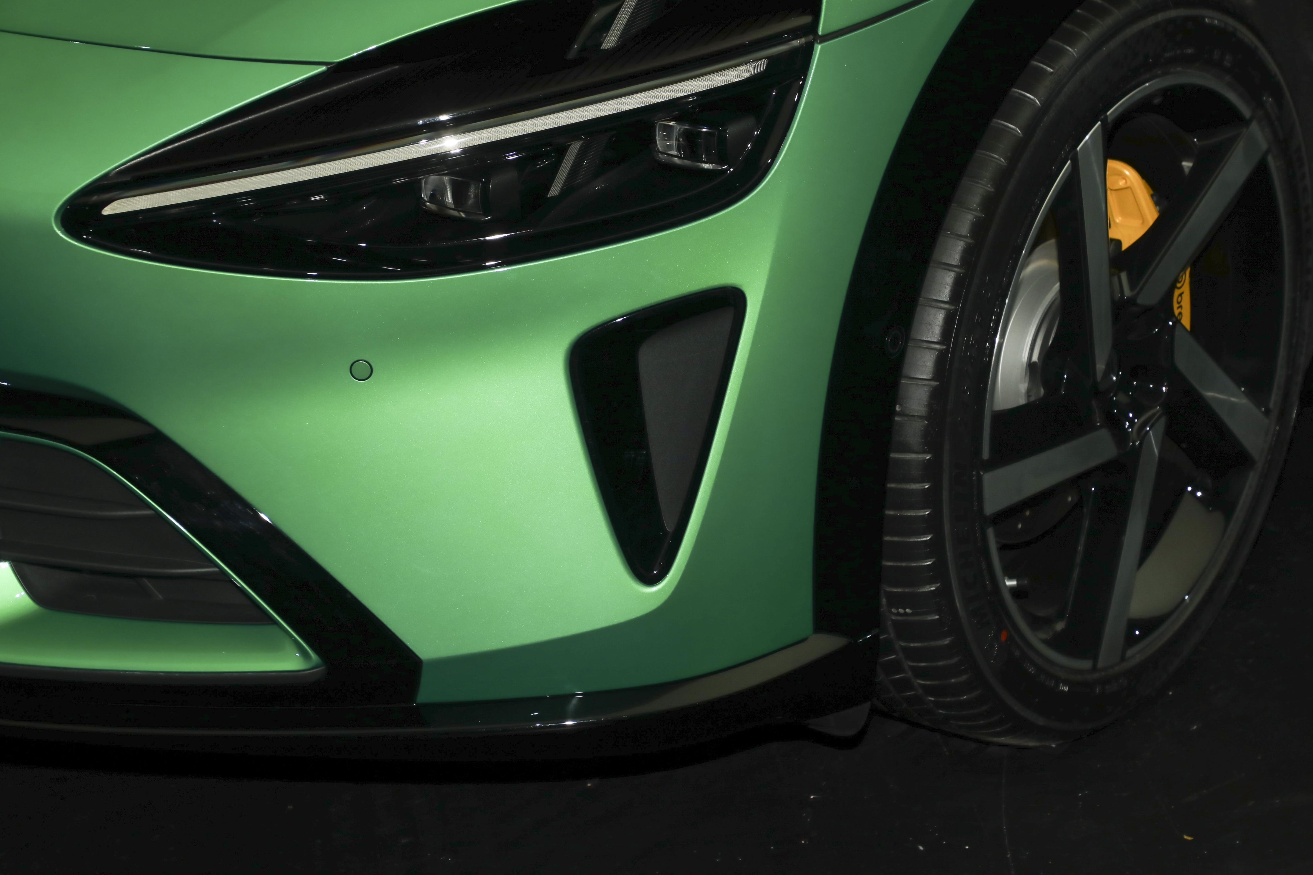 小米YU7 Max实拍车型配备21英寸五辐样式轮辋和米其林Pilot Sport EV轮胎,前轮胎规格为245/45 R21,后轮胎规格为275/40 R21,并配备有黄色Brembo四活塞刹车卡钳以及打孔刹车盘。