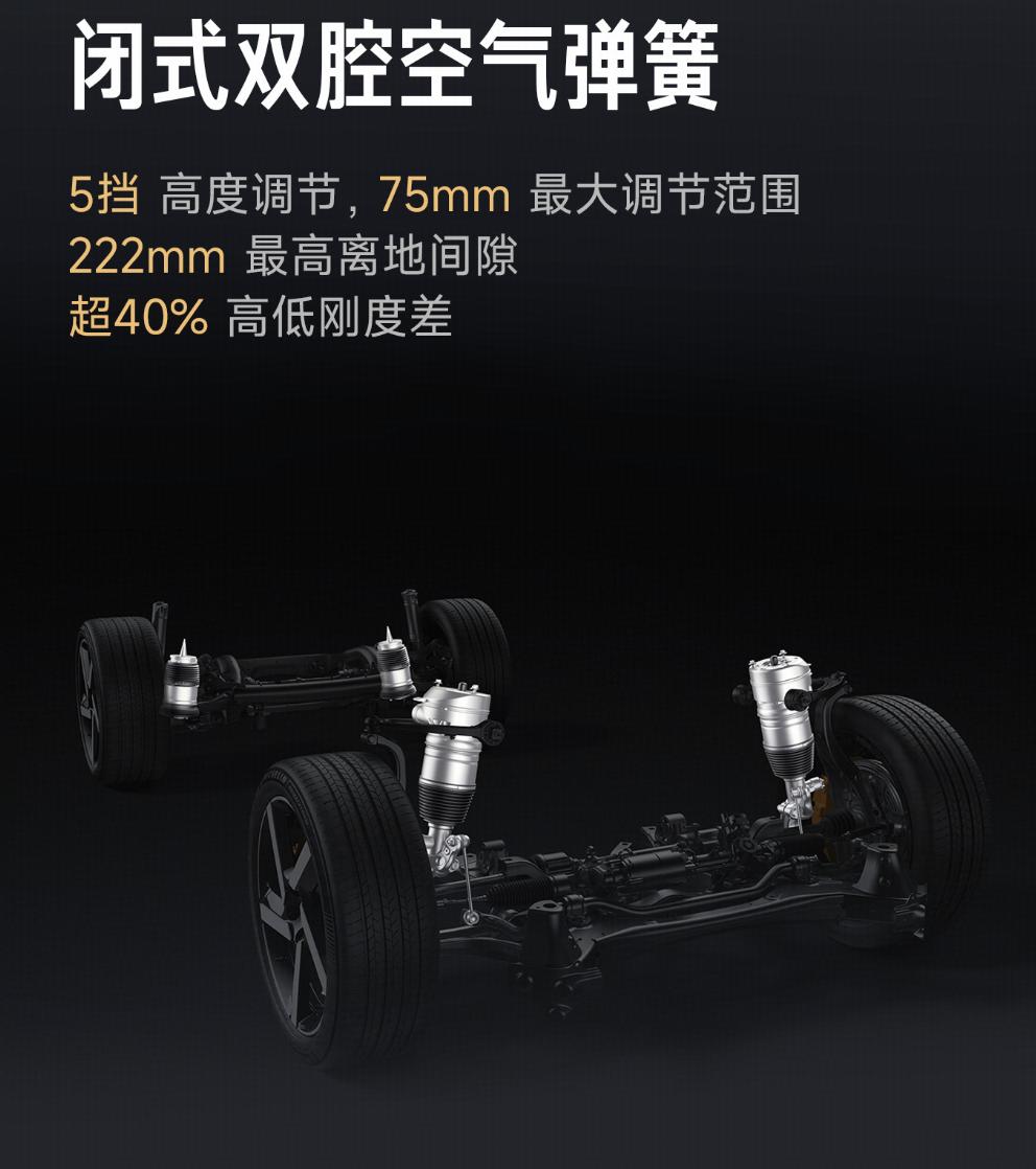 底盘部分,小米YU7配备有前双叉臂+后五连杆独立悬架结构,并配备闭式双腔空气弹簧和连续阻尼可变减振器,其中闭式双腔空气弹簧具备75毫米最大调节范围,可实现最高222毫米离地间隙。