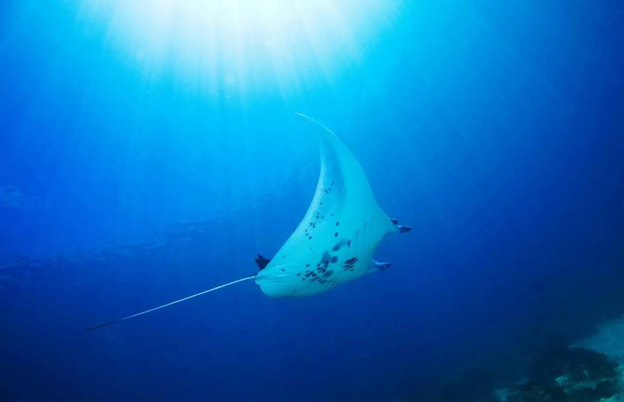 印尼海底的魔鬼鱼,它扬起鱼鳍,就像在空中飞舞。