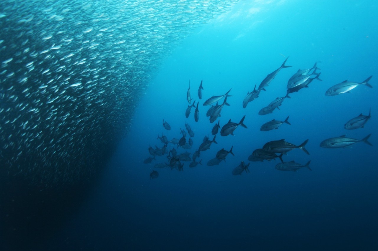在菲律宾墨宝,吞拿鱼和杰克鱼围猎沙丁鱼,场面壮观。