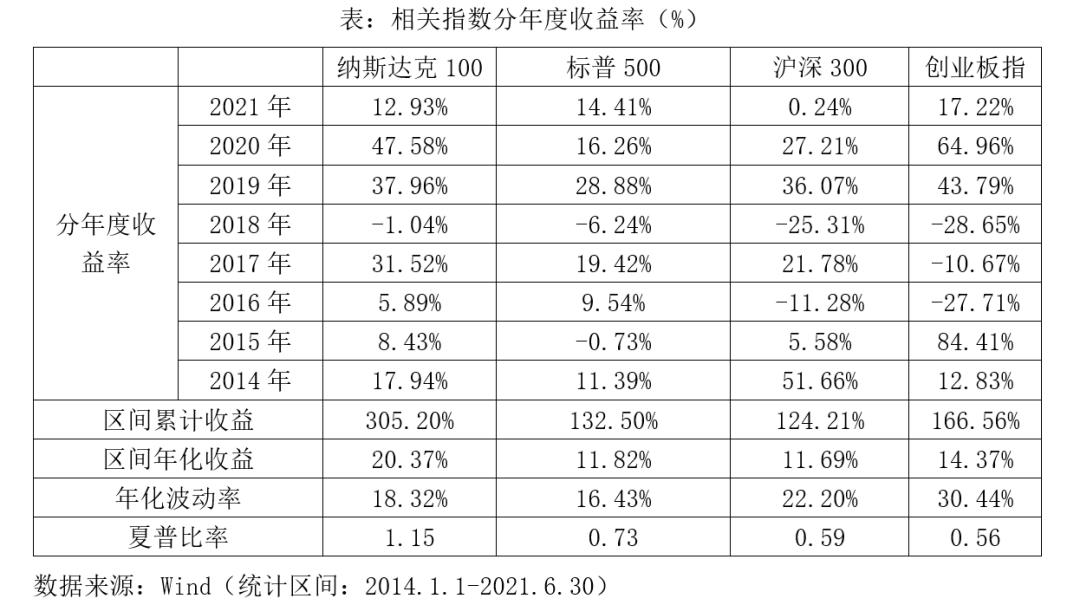 下图展示了纳斯达克100指数和美股、A股主要宽基指数的2014年以来的走势对比。它们的分年度收益和区间年化收益率在之后的表中展示。数据显示,纳指100指数有着更高的年化收益率,较小的波动率,因此具有较高的夏普率。