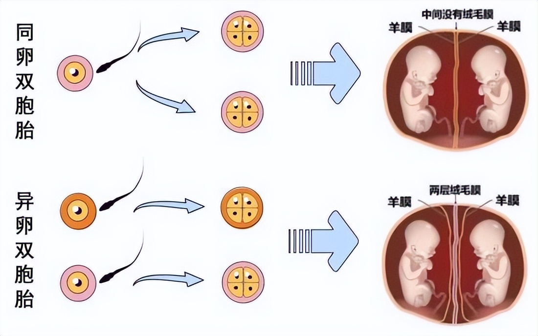 我们刚才提到的单卵双胞胎其实并不是唯一的双胞胎形式。单卵双胞胎还可以根据胚胎分裂的情况,分为“单绒单羊”和“单绒双羊”。这两个术语听起来可能有点复杂,什么意思呢?就比如,两个双胞胎就像是两个宝宝住进了一个房子里。如果他们共用一个房间,没有隔墙,这就是“单绒单羊”。而如果他们分别有了各自的房间,即便住在同一栋大楼里,他们还是有独立的空间,这就是“单绒双羊”。