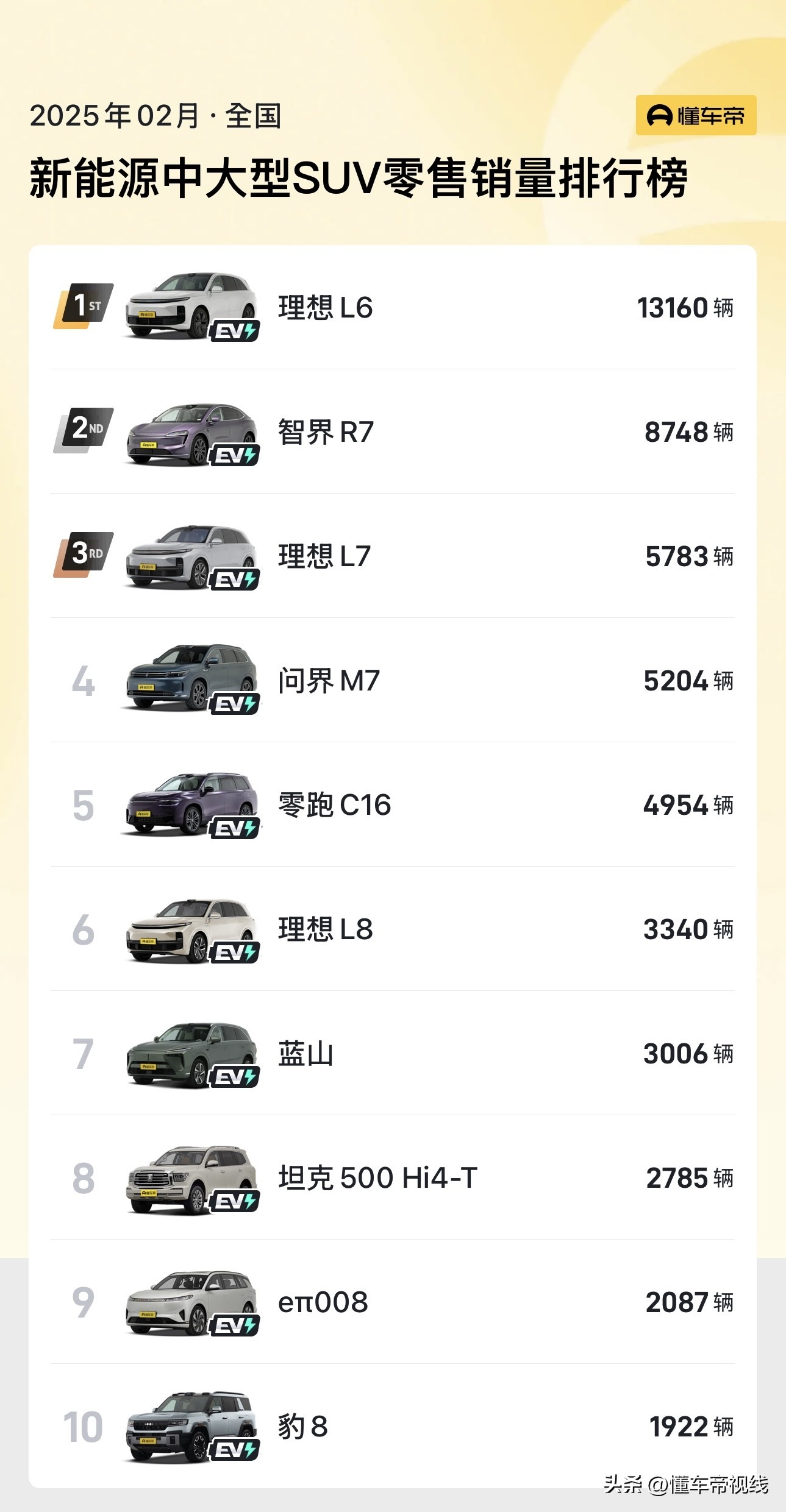 竞品方面,东风奕派eπ008定位于新能源中大型SUV,主要竞争对手指向理想L6(指导价24.98万-27.98万元)、问界M7(指导价24.98万-32.98万元)等车型。参考销量来看,eπ008今年2月销量为2087辆,位列当月细分市场销量榜第9位。有关东风奕派的更多消息,我们将保持关注。