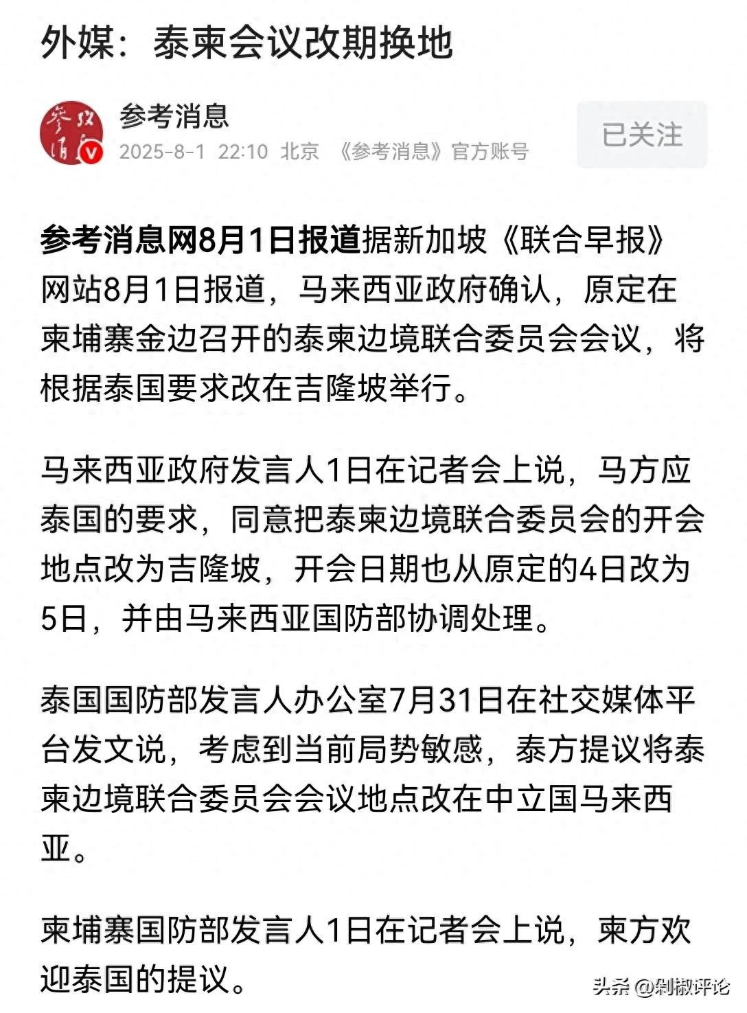 柬埔寨明知自己理亏,因此,就只能接受泰国的要求跟安排,被泰国牵着鼻子走。泰国提出的最新要求是:“考虑到当前局势敏感,泰方提议将泰柬边境联合委员会会议地点改在中立国马来西亚。”