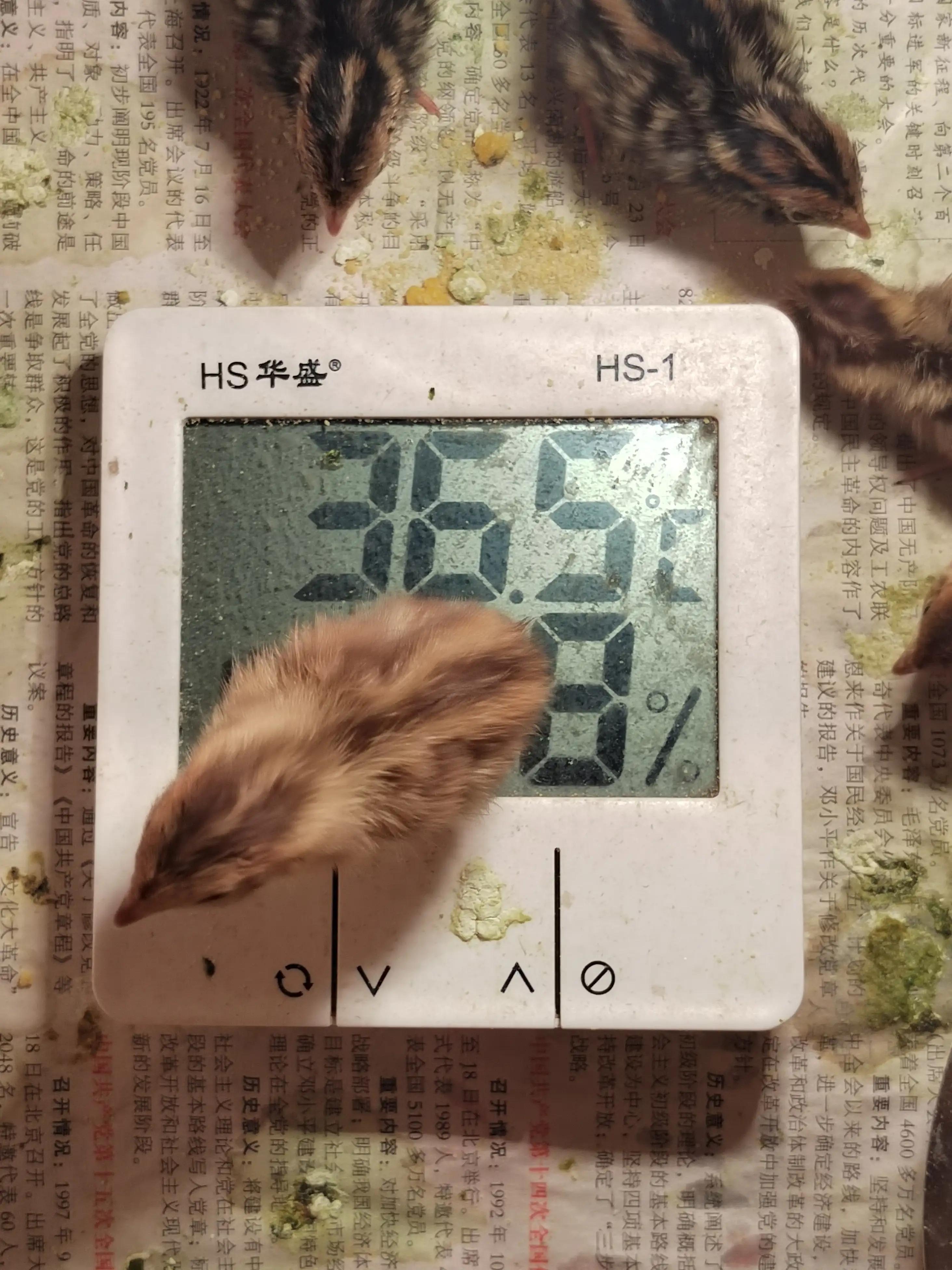 我的育雏箱使用的是厚纸箱,箱底铺一层泡沫,上面铺报纸。纸箱顶部一根铁杆挂上60W白炽灯进行加温,因为白炽灯更容易获取和使用。底部再放个温度计。